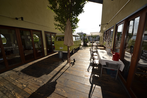 庭のおしゃれなカフェスペースでおいしいお菓子をお召し上がりください。